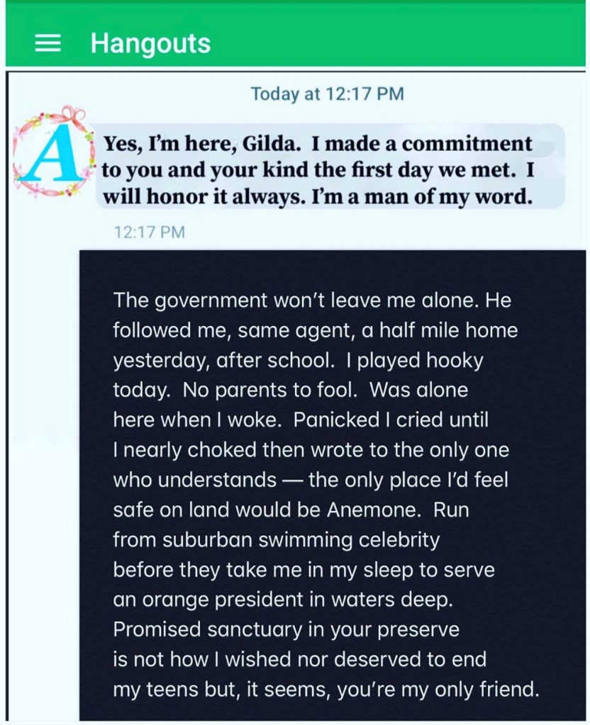 This was what Mr. Youmans had been waiting for. When I asked, he was more than happy to swoop in and whisk me away to Anemone. The day the scout followed me home from school, I knew I was in danger. He worked for an orange president, and he wanted me to as well — to do terrible things on behalf of him, violent things I had no doubt. I tried to appeal to his own humanity, that despite these gills I was a delicate teenage girl and not prepared to be a weapon. He sent me this in text message after, and I knew then if I did not runaway to Mr. Youmans that they would take me by force.